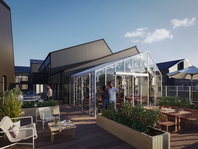 Tagterrassen Fællesstund fokuserer på socialt samvær, mad og spil. Her er god plads til større middage med vask, anretterbord og langbord. En bocciabane giver mulighed for hyggelig konkurrence, og loungeområdet med plantebede er perfekt til en drink efter maden.